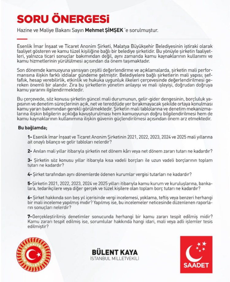 Saadet Partisi Milletvekili Bülent Kaya, Malatya Büyükşehir Belediyesi iştiraki olan Esenlik Şirketinin durumu hakkına TBMM Başkanlığına soru önergesi vererek şirketin 5 yıllık kar ve zarar durumunun açıklanmasını istedi.