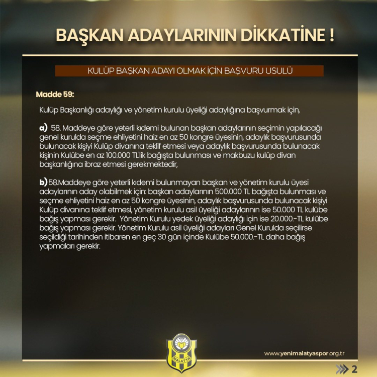 Yeni Malatyaspor Kulübündan yapılan paylaşımlardan kongre ilanları ile Yönetim Kuruluna girme şartları ve Başkan adaylarında aranan şartlarında paylaşılması dikkat çekti.
