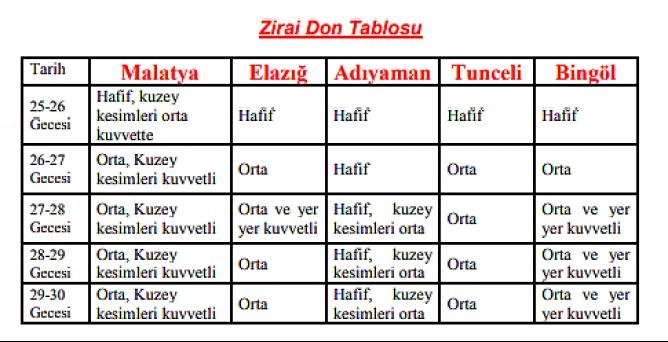 Meteoroloji Bölge Müdürlüğü tarafından 5 Gün sürecek zirai don uyarısı yapıldı. Bu akşam saatlerinden başlayıp Salı Gününe kadar devam edecek olan zirai son olayı gece ve sabahın ilk saatlerinde etkili olacak. Malatya’nın kuzey bölgelerinde (Arapgir, Arguvan, Darende, Hekimhan, Kuluncak ve Yazıhan ilçeleri üreticilerinin daha dikkatli ve tedbirli olmaları istenen uyarıda;