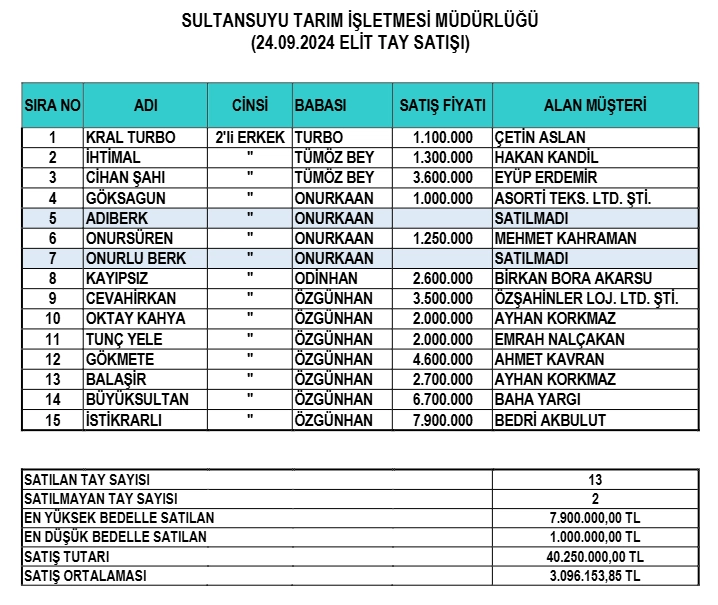 Buna göre geçen seneye göre Sultansuyu Elit Tay Satışlarında işletme cirosunu % 134 arttırmış oldu.