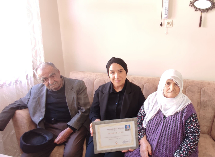 Emine nineyi evinde ziyaret eden Doğanşehir İlçe Milli Eğitim Müdürü Mehmet Çoban ve Şube Müdürleri Emine nineye başarı belgesi takdim ettiler.