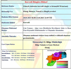 Beklendiği yer; “Elazığ, Malatya, Bingöl ve Tunceli illerinde güney yönlerden kuvvetli rüzgar ve fırtına ( saate 40-70 Km/saat)
