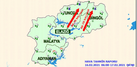 “Bir süredir mevsim normalleri üzerinde seyreden hava sıcaklıklarının 16.02.2021'e kadar devam etmesi beklendiğinden Tarım ile uğraşan vatandaşlarımızın meydana gelebilecek olumsuzluklara karşı dikkatli ve tedbirli olunması gerekmektedir. Sabah ve gece saatlerinde yer yer buzlanma ve don olayı ile birlikte, sis ve pus hadisesi beklendiğinden özellikle ulaşımda meydana gelebilecek olumsuzluklara karşı dikkatli ve tedbirli olunması gerekmektedir. Bölgemizde kar erimesi nedeniyle su baskını ve dik yamaçlarda çığ oluşma riski bulunduğundan, meydana gelebilecek olumsuzluklara karşı dikkatli ve tedbirli olunması gerekmektedir.”