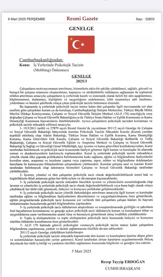 Cumhurbaşkanı Recep Tayyip Erdoğan’ın imzasıyla iş yerlerinde psikolojik tacizin (mobbing) önlenmesine yönelik düzenlemeleri içeren genelge, Resmî Gazete’de yayımlandı.