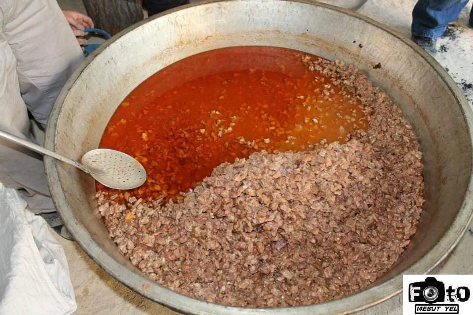 Altına bir bez veya naylon serilmiştir yemeği pişirecek aşçı orada hazırdır etler birer birer asılı olduğu yerden getirilir bir ağaç dalına veye bir kancaya asılır elinden gelen iki kişi burada eti kemiğinden ayırırlar diğerleri hazırlanan doğrama alanında eti doğramaya başlar muhabbet koyulaşır düğün sahibi et doğrayanlar için kesilen koyunların ciğerlerinden yemek hazırlar aşçı yağlı eti ve siyah eti ayrı ayrı doğratır ve et doğrayanların başında doğranan etin büyüklüğünü yağlı etin ayrı doğranıp doğranmadığını kontrol ederek istediği gibi doğramayana müdahale eder ve istediği gibi doğramasını sağlar doğranan bu etler önceden hazırlanmış serin oda veya mutfaklarda karıncaların giremeyeceği yerlere bezlerin veya masaların üzerlerine yağlı et bir tarafa siyah et bir tarafa ayrı ayrı serilir karıncalardan korumak için masanın ayakları su dolu kapların içine konur bu etler doğranırken elinden gelen bir kişide kemikleri kırmaya başlar kırılan kemikler yemeğin pişeceği yerde hazırlanan ocağın birine konan kazana doldurulur.